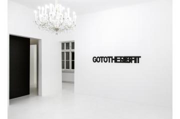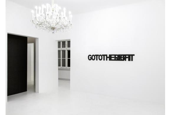 Aus MDF-Holz gefertigt und schwarz lackiert, werden zwei Sätze mit den Worten „GO TO THE LEFT" und "GO TO THE RIGHT" überlappend als Wandobjekt installiert. Bei dieser Arbeit hebt sich die Wortbedeutung von „left“ und „right“ durch die Überlagerung der Buchstaben zugunsten der Textform auf, Schriftzeichen werden an Schriftzeichen gereiht und verdichtet.