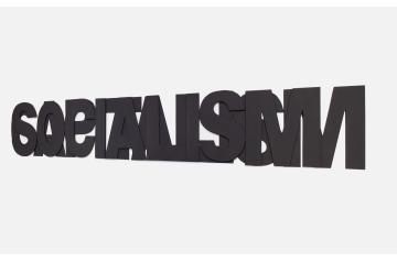 Zwei Worte „SOCIALISM“ und „CAPITALISM“, mit Buchstaben aus schwarz lackiertem MDF-Holz als Objekt überlappend an die Wand montiert.