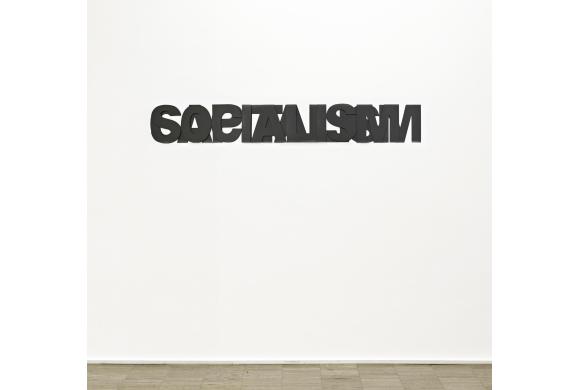 SOCIALISM/CAPITALISM (2019). Hier werden einem gleichsam zwei Seiten einer Medaille vorgeführt, und es scheint gleich ums Ganze zu gehen, um nichts weniger als um politische Ideologien. Als Schriftbild ist diese Arbeit komplizierter als die durch die Doppelung der einzelnen Buchstaben Redundanz evozierenden Adjektivpaare. "SOCIALISM/CAPITALISM" wirkt rätselhaft und unentzifferbar, eine fremde Sprache? Aber welche?