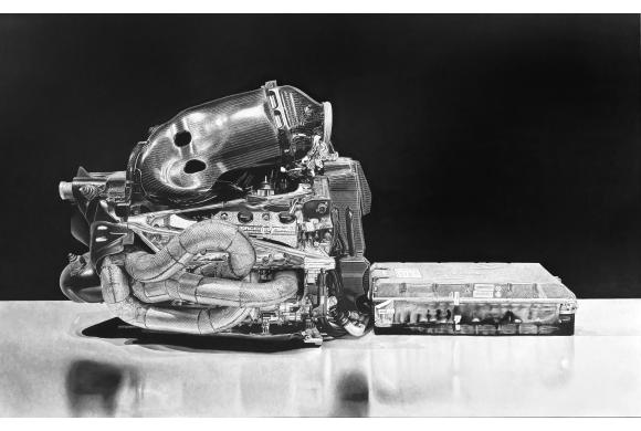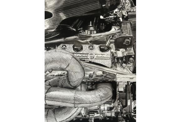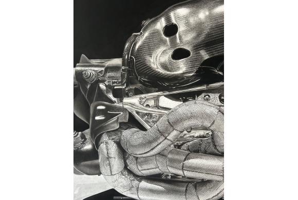 In einer Welt, in der Effizienz zum höchsten Prinzip erhoben wird, setzen diese Arbeiten einen bewussten Kontrapunkt. Die fotorealistischen, großformatigen Kohlezeichnungen von Formel-1-Motoren zeigen Maschinen, die einst für maximale Leistung entwickelt wurden – nun jedoch in einem extrem zeitaufwendigen, ineffizienten Prozess festgehalten. Jeder Strich, jede Schattierung konserviert nicht nur die Form dieser Motoren, sondern auch eine persönliche Sichtweise auf ihre ästhetische und symbolische Bedeutung.
