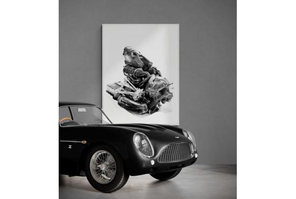 Während einige dieser Motoren als technologische Meilensteine museal erhalten bleiben, wird hier nicht ihre Funktion, sondern ihre Schönheit bewahrt. Die präzisen Zeichnungen stellen nicht ihre Effizienz in den Vordergrund, sondern ihr Design, ihre Materialität, ihre fast organische Struktur. Sie verdeutlichen die enge Verbindung von Technik und Natur: Kolben und Ventile wirken wie künstliche Organe, filigrane Kühlrippen erinnern an das Gerippe eines Raubtiers.