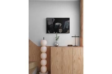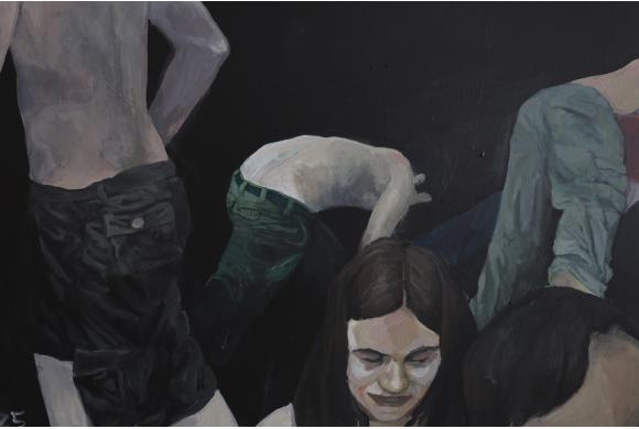 Die Malerei „Alienation“ ist Teil einer Serie von Malereien, in der die Künstlerin das Verhalten von Menschen in Menschenmas-sen in diversen Konstellationen untersucht. So balanciert die Menschengruppe in „Alienation“ auf einer feinen Linie zwischen Miteinander und Gegeneinander.