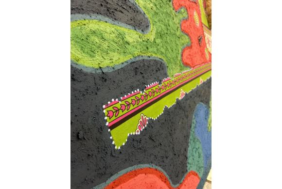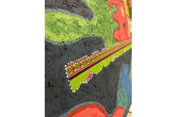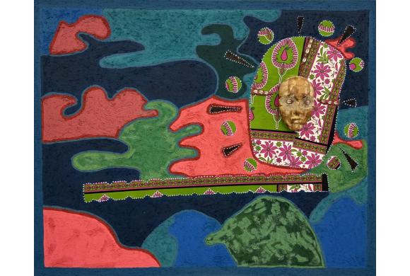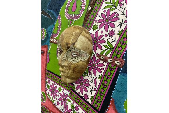 Acrylfarben, pigmentierter Elefantendung, ugandischer Rindenstoff, Kanga-Textil, Kaurimuschel und Häkelspitze