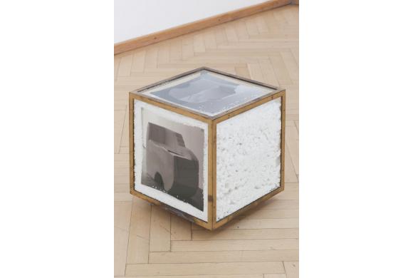 copper vitrine with glass, Styrofoam, 2 pigment prints on Hahnemühlen rice paper, plastic feet