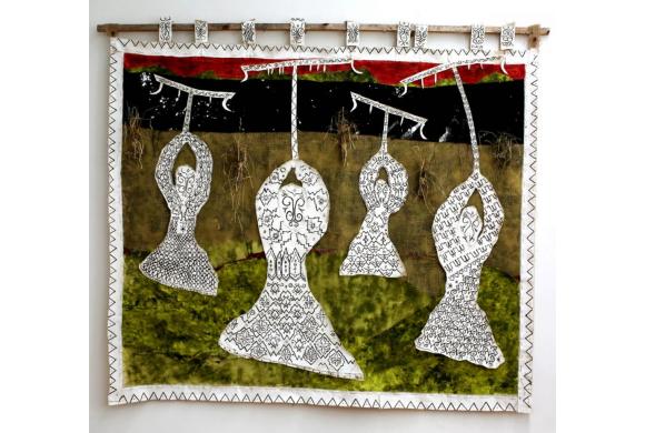 Mixed Media Technik auf Baumwollstoff auf Holzleiste gehängt, Textile, Ölfarbe, Tusche