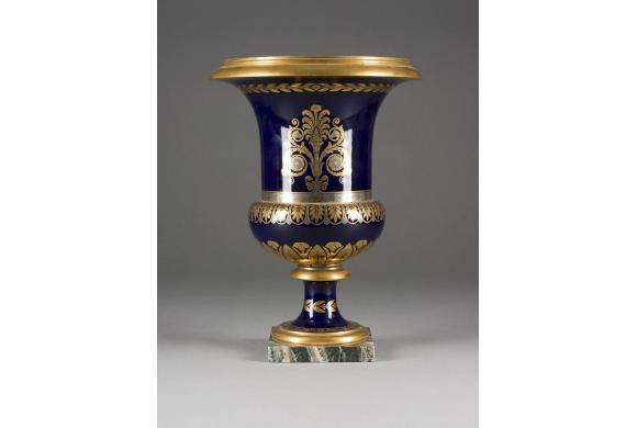 Kratervase Porzellan, Kobaltblaufond, Goldstaffage H. 41 cm