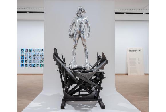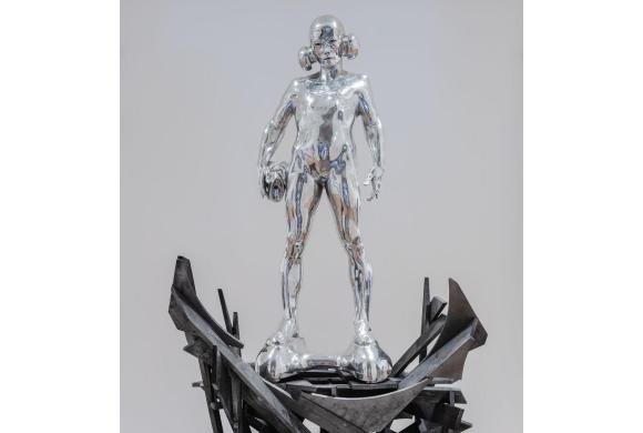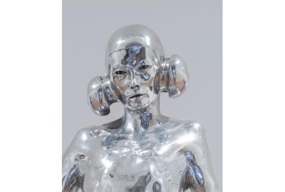 The sculpture MONOMON, a bronze cast of a hand carved wooden sculpture. The cast owes its white, china-like surface to a burned-in glaze that magnifies the magical enchantment of this androgynous mythical beast with its strangely opalescent cryolithglass eyes.